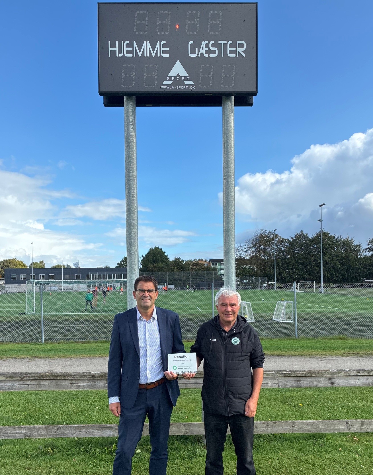 Afdelingsdirektør Torben Bloch-Nielsen fra Sparekassen Danmark udtrykker stor glæde ved, at denne donation har givet Viborg FF muligheden for at opstille de 2 måltavler, som nu bliver til stor glæde og gavn for klubbens mange medlemmer.